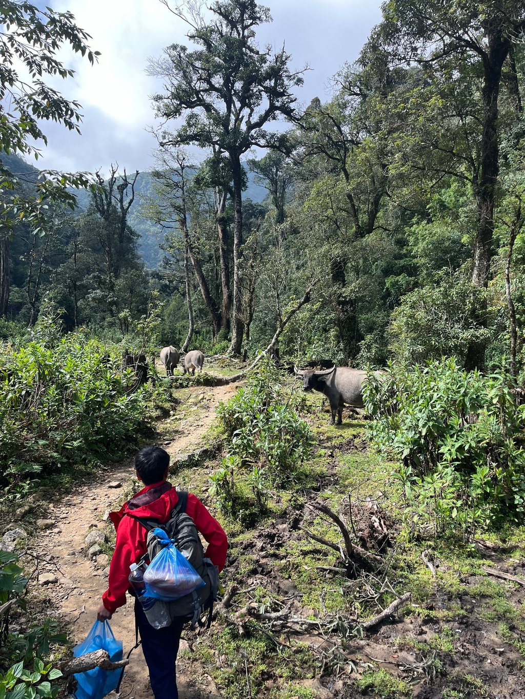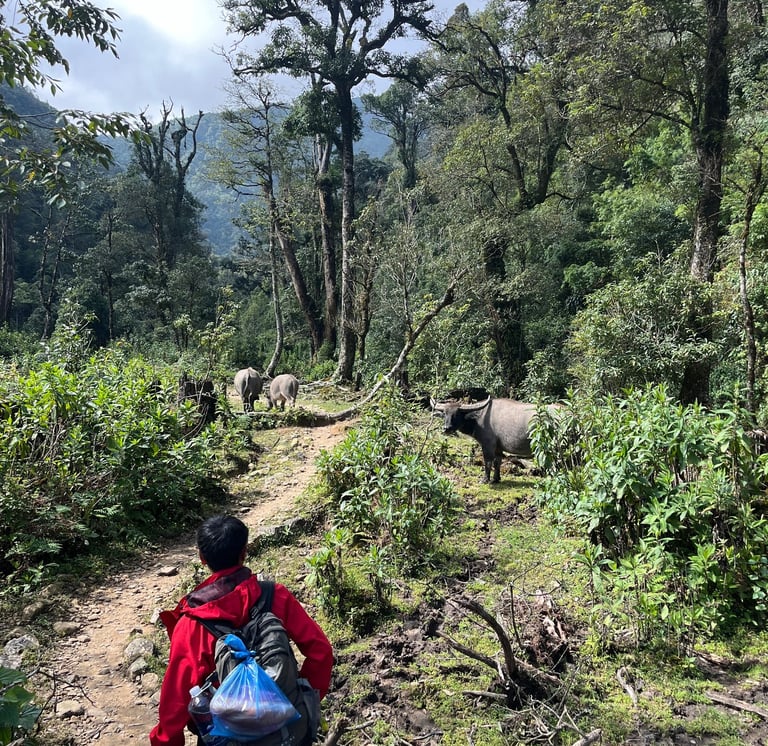 We started hiking at around 10am, gradually making our way uphill through forests. We saw some bison, and he told me you can often see big green snakes, so to keep an eye out. He didn't speak much English, but enough for us to be able to understand each other (very English of me to count on him to speak my language). My Vietnamese stretched as far as Cảm ơn (thank you) and Xin chào (hello), and even then I still sometimes got these confused. Admittedly I did say hello after being given food at a restaurant a couple of times.