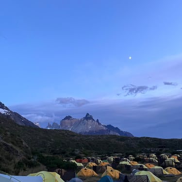 After 2-3 hours we made it to Paine Grande campsite. Located next to Lago Pehoé, Paine Grande campsite has a large area set up for pitching tents and pre pitched tents, indoor areas for cooking, and refugios for a more luxurious sleeping arrangement. Views of the Paine Massif tower over to the North-East tower over the camp, making you feel tiny.