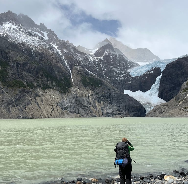 Off we went, with around 1200m of descent until we reached Campamento Grey. With 15kg bags on our backs, and already having put 50km into the legs over the previous days, our knees had to be strong. We were very lucky with the weather, it was very cold, but there was almost no wind. It was a steep downhill, taking around an hour to reach the bottom, at 500m altitude, with gradual rolling ups and downs from here on out to the camp site. A really scenic stretch with expansive views of the Grey Glacier for almost the whole way. A quick break to have some water and a snack at the Paso ranger checkpoint, there to ensure everyone comes through from the pass, and we continued on. For lunch we scrambled up to a viewpoint overlooking the Grey Glacier in awe of the unimaginable scale. Photos can't do it justice (again).