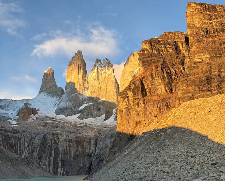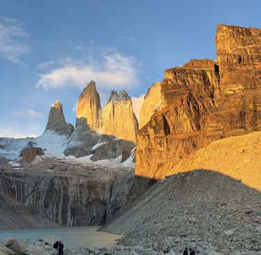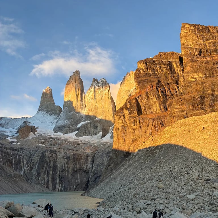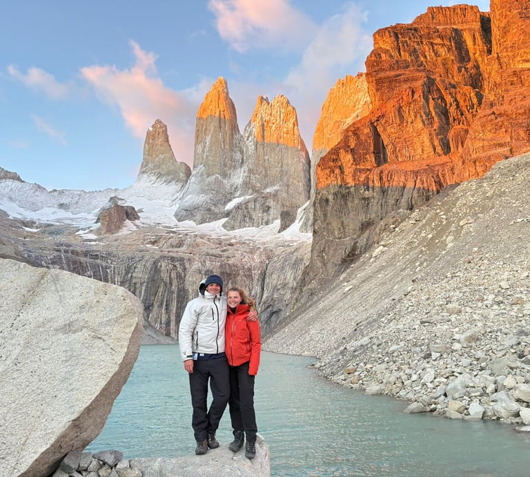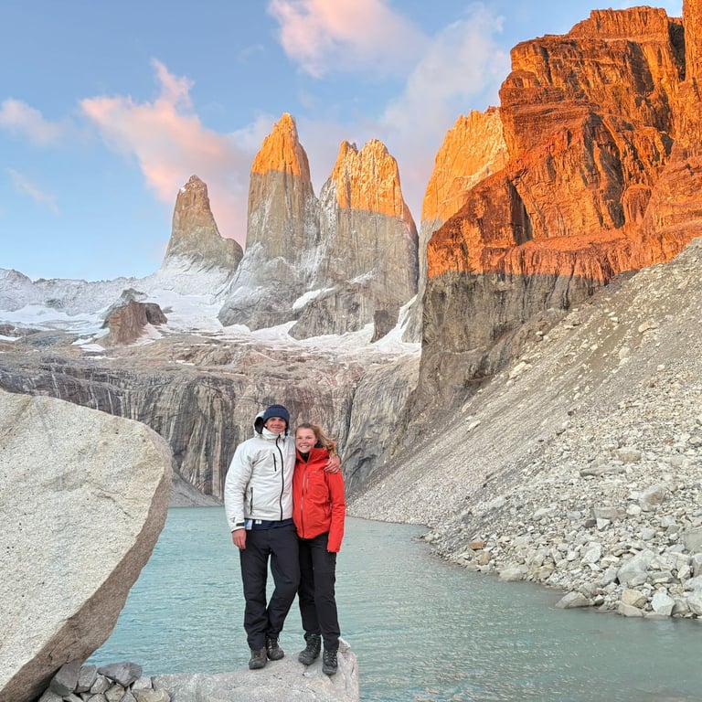 to make sure we reached the Las Torres base to watch the sunrise. We hiked for 12km in the dark up to the top, with Michl. The walk was insane, we saw the most amazing stars and yellow moon. Walking in the dark was an experience in itself, especially for such a long distance - turning back and looking back down the mountain in complete darkness, we saw little lights from other people also doing the sunrise walk. Once we got to the top and looked around, all the familiar faces popped up, Evan and his dad and then the 3 friends we met the day before. We all watched the sunrise, it was just so heartwarming we were all there together!
